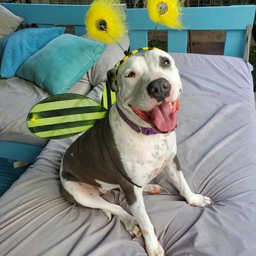 Claire, more than any other dog we've met, loves a good costume moment! She's been a rabbit, a bee, and much more!